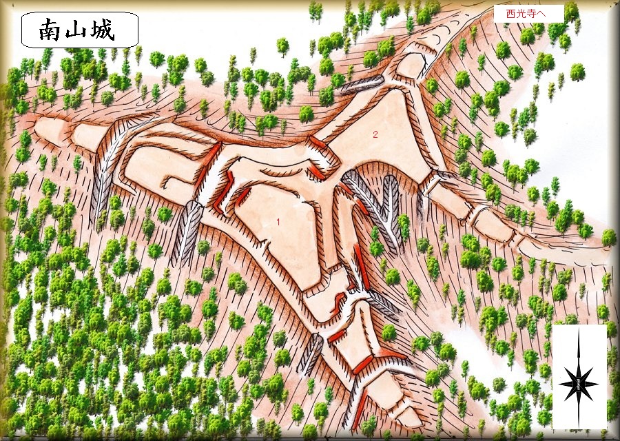 南山城は、西光寺の背後にそびえている比高50mほどの山稜に築かれている。祇園山あるいは城山と呼ばれている山稜である。
