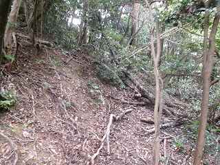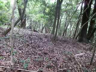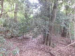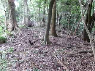 尾根上は幅があるので、それなりの平場が確保されている。また周辺部には腰曲輪状の地形も見られるのだが、自然地形の部分が多い印象である。