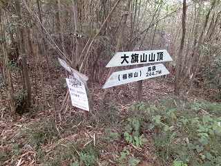 そうして山頂に到達した。そこには「大旗山山頂」の案内が立てられていたのだが、けっこうなヤブ状態である。
