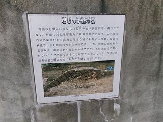 また、堤の北端部・南端部の確認調査により、堤防は海側に石堤、陸側に土堤を併せもつ非常に強固な構造体であり、高さは石堤が約4m、土堤が約5mで、基底部の幅は推定で24m以上にも及ぶことが考えられます。」
