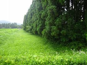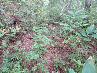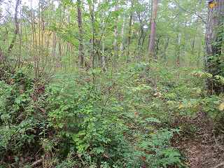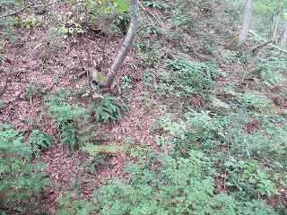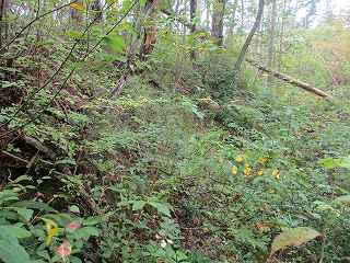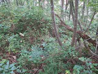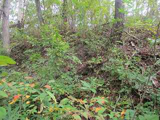 | ここからは障子堀の写真なのだが、ヤブのため写真ではよく分からない。 | 障子堀の外側の土塁。 |