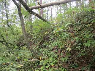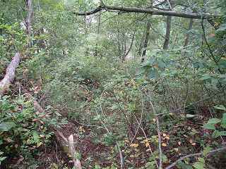| 中央の虎口。城内はひたすらヤブである。このヤブの中でスマホを落としてしまった・・・。後で気が付いたのだが、探すのに時間がかかってしまった・・・。みなさんも、ヤブ漕ぎ中にスマホを落とさないように気を付けましょう! | 虎口から見た堀切の折れ部分。 |