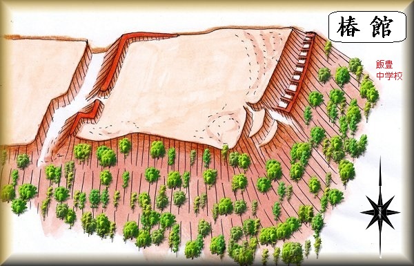 椿館は飯豊中学校グランドの西側にそびえる比高20mほどの台地先端部に築かれていた。
