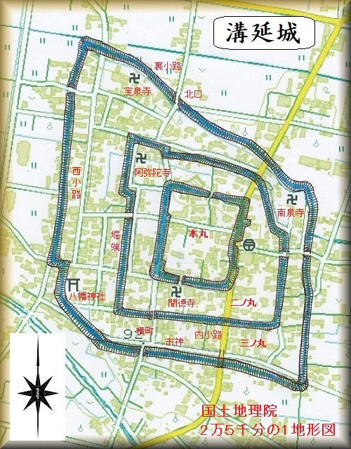 溝延城は、市街地化によって遺構が失われてしまっているが、上記の図と航空写真とを参照してみると、だいたいの構造を想像することができる。そこで、国土地理院の地形図に落としてみたのが右の図である。現在も、本丸、楯、堀端、土堤山などの地名を残している。