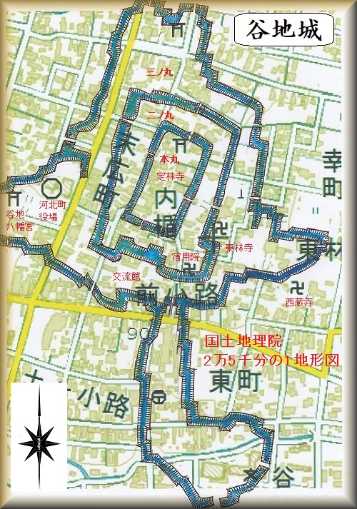 谷地城も、市街地化によって遺構が失われてしまっているが、上記の図と航空写真とを参照してみると、だいたいの構造を想像することができる。そこで、国土地理院の地形図に落としてみたのが右の図である。