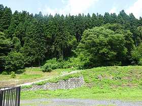 | 二ノ丸入口。虎口は何度も折れながら進入するようになっている。 | 二ノ丸内部。奥の高台が本丸。 |