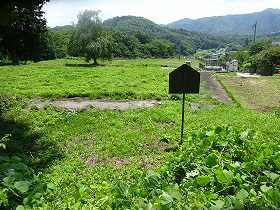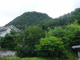 | 小学校跡地(居館跡)から遠望する中山城。ここからの比高は40mほどである。 | 登り口から居館跡を見たところ。 |
