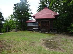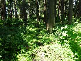| 神社の脇には池があった。ちゃんと水がある! 山頂なのに池があるとは意外である。 | 白土平から下の北平に降りていく道。 |