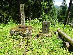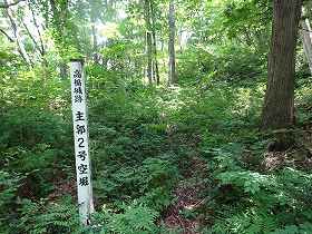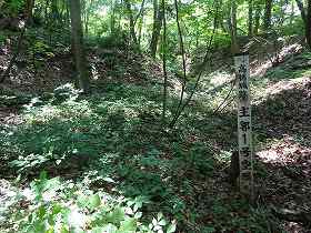 そこから虚空蔵山のへの道を登っていく。するとその先にもちょっとした横堀が存在していた。そこには「主郭2号空堀」と書かれた標柱が立っている。このように高楯城は、あちこちに遺構の名称を表示している親切な城であったようだ。とはいえ、現在はあまりメンテナンスされていないようで、登城道もあまりはっきりしていなくなってしまっている。、
