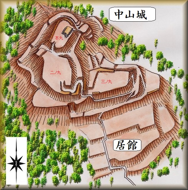 | 中山城は、永禄・元亀年間に、伊達輝宗の命を受けた中川弥太郎によって築かれたという。最上氏領域と接する最北端にあり、境目の城としての重要な拠点であった。 天正末期、当地域は蒲生氏に与えられた。中山城には1万3千石で入部し、城の改修を行った。本丸にみられる天守台が構築されたのは、この際のことであったと考えられる。 慶長3年、上杉氏領となると、横田旨俊が中山城代となって入城した。 近世になると城は廃され、御役屋となり、城代は御役屋将と呼ばれていた。 |