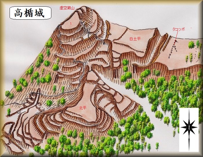 | 高楯城は、最上氏領域の南端にあたり、境目の城として重要な拠点であった。城代として守っていたのは最上氏一族の満長であった。その後、この一族は武衛氏を名乗り、代々最上領域の南端を守っていた。南側の伊達領との間の境目の城というべき城である。 伊達氏との抗争の中で、伊達氏によって落城させられたこともあるという。 『最上斯波家伝』には「上ノ山の城、其の頃は西山虚空蔵の腰北に当たって高楯の城と云ふ」とあり、古くはこの城が上ノ山城と呼ばれていたことが分かる。 |