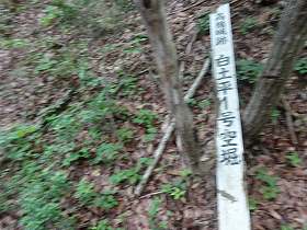 さいわい、南端辺りに堀を登っていくための木の階段が付けられていたので、そこから白土平に上がっていける。といってもこの階段は壊れかけているので、あまりあてにならない。この登り口の脇に、「白土平1号空堀」と書かれた標柱が倒れていた。