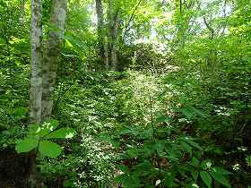 この先が白土平である。ここはかなり広い平場となっており、東西に100mほどの規模がある。これだけの面積があれば、かなり多数の兵員を配置しておくことも可能である。堀切の側には土塁も盛られている。