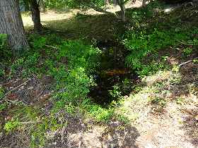 遠目に、面積がありそうな山頂には見えなかったのだが、実際の山頂部は直径30mほどはあり、思ったよりも広くなっていた。その後、神社の方を見てみると、神社の脇には水をたたえた池があった。このような山頂部分に池があるとは驚きであるが、籠城には欠かせないものである。それとも昨日の雨でたまたま溜まったものなのであろうか。