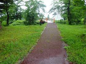 | 1郭内部。奥に2郭との間の堀切に架かる赤い橋が見えている。 | 2郭内部。広い広場となっている。 |