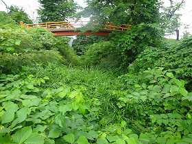 その先に赤い橋が架けられた堀切がある。なかなかしっかりしたj堀切なのだが、内部はすっかりヤブ化してしまっている。