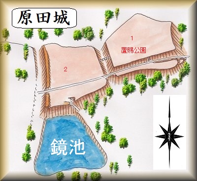河島ダリア園の北東にある置賜公園が、原田城の跡である。比高15mほどの台地の先端部となっており、南側下には鏡池がある。東側からアクセスしたら、途中の道が細くてわかりにくかったのだが、実際には公園の西側に駐車場と城址碑がある。