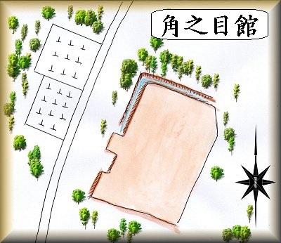 東大塚集落の墓地の東側の山林内部が角之目館の跡である。