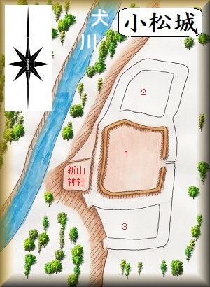 犬川の東岸にある新山神社の一帯が小松城の跡であり、地図にも掲載されている。かつて本丸は中学校として使用されていたとのことだが、現在でも本丸周辺の土塁は残されている。またj堀は水路となっているようだ。