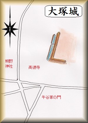 大塚の高徳寺の一帯が大塚城の跡であり、道路を挟んで南側には、かつて大塚城の大手門であったと言われる牛谷家の門が残されている。こちらは、地図にも掲載されている。