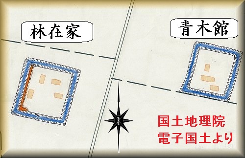 こちらも民家の敷地となっているため、内部立ち入りはしていない。しかし、航空写真を見てみると、方形の城館の形状が明らかである。