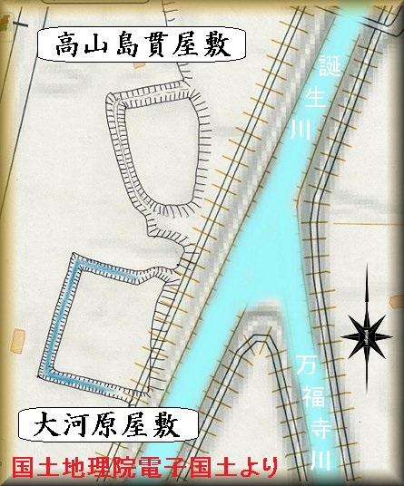 誕生川と万福寺川とが合流する地点のすぐ北西側が高山島貫屋敷の跡、それに隣接する南側が大河原屋敷の跡である。