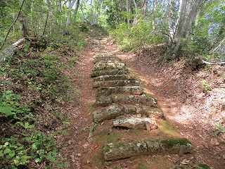 | 東方から遠望する柳澤館。ここからの比高は80mほどある。 | 薬師堂へと続く石段。なかなかいい感じの石段である。 |