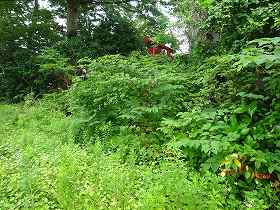 | 北側にわずかに残る土塁に稲荷神社が祭られている。 | 土塁北側の堀跡。 |