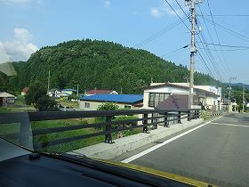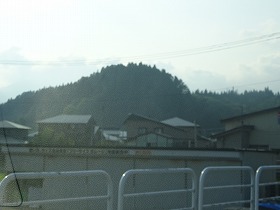 | 東南から遠望した判兵衛楯。ここからの比高は80mほどある。 | 山麓に見える赤い鳥居。ここから登っていける。 |