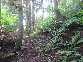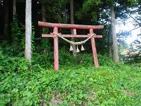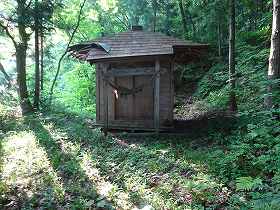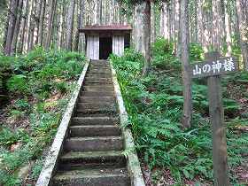 | 登り始めてすぐに幅広の腰曲輪が見えてくる。その先には写真のような横堀城の地形も見られる。この先が神社である。 | 中腹に祭られている神社。「山の神様」とある。 |