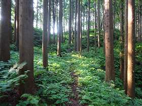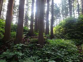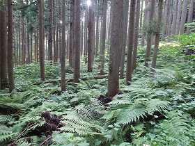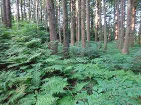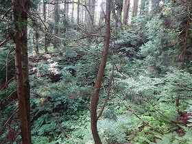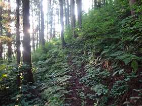 | 東側の山麓から遠望する城址。ここからの比高は100mほどある。 | 珠徳寺の右手奥から登り始める。すぐに段々の平場が見えてくる。しかし、シダだらけである。 |