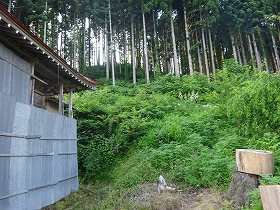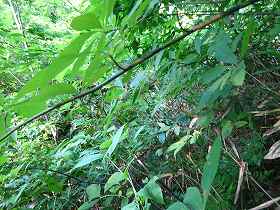 観音堂から1郭まではもう30mほどであり、すぐそこに見えている。ところが、登り口の辺りはどこもすごいヤブで、まったく取りつくことができない。冬場であれば、問題なく登れるのであろうが、今は真夏、とても通り抜けられるような感じではなかった。上の方まで登っていけば、ヤブは少なくなりそうなのだが、とてもそこまで到達できるとは思われない。