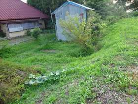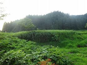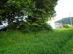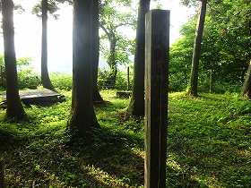 | 主郭下方にある神社。登城道は神社の参道として使用されているようだ。 | 1郭内部。奥に土塁が見えるが、高さ5mほどもある巨大なものである。 |