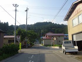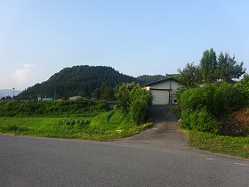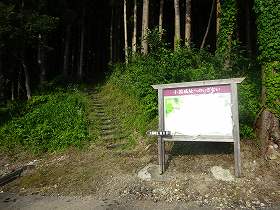 | 西方から遠望する小国城。ここからの比高は90mほどある。 | 小国城の登り口。公民館のすぐ脇である。車は公民館の駐車場に停めさせていただいた。ここで畑作業をしているおじさんが「すぐ近くに井戸の跡があるよ」と教えてくれた。 |