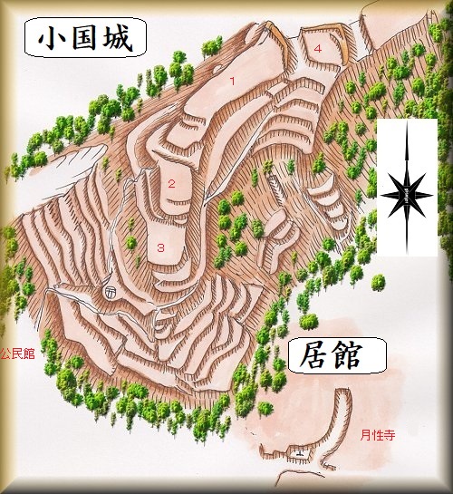 小国城は、月性寺の北西側にそびえている比高90mほどの山稜(お城山)に築かれていた。山稜の西側山麓に公民館があり、そこが城内への遊歩道の入口になっている。車もこの公民館に停めておくことができる。