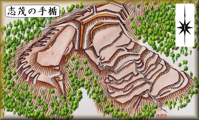 志茂の手楯は、珠徳寺の背後にそびえる比高100mほどの山稜に築かれていた。登り口は珠徳寺の右手の奥に入り込んだところにあり、ここからの比高は70mほどである。ただし、地形図を見てみると、城の西側に回り込んでいる林道を進んでいけば、2郭まで比高30mほどのところまで車で行けそうである。ヤブが少なければ、そちらからアクセスするのが一番早いのではないだろうか。しかしヤブの状態がどの程度なのか分からない。