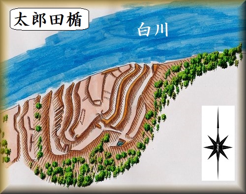 実際の太郎田楯は、小国城防衛の前線基地として取り立てられたものであったと思われる。しかし、発想を変えて、小国城攻撃のための陣城であったという可能性もあるだろうか。というのも多重に横堀を巡らせるという構造が、この地域の城郭としては違和感を感じるからである。