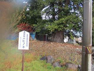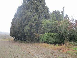 | 南西側の堀跡。 | 南西の土塁上にある金田家のヒノキ。 |