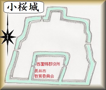 長井市教育委員会の北側、旧置賜郡役所の一帯が小桜城の本丸であったという。郡役所の東側前の道路に城に関する案内板が設置されている。