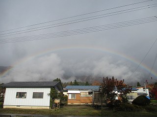 | 戸根林館跡付近に架かっていた虹。雨だ〜。 | 館周辺は作業林道によって削られている。遺構近くまで林道を通って行くことができる。 |
