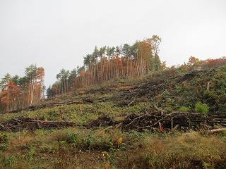 あきらめかけたのだが、そのまま車で少し進んで行ってみると、急に視界が開けてきた。城山の側面部の木は全面的に伐採されており、山頂に近い部分まで作業林道が付けられているのであった。