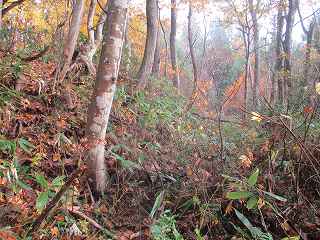 作業林道の終点から斜面を登って行くとすぐに横堀が見えてきた。その上にも横堀があり、横堀は一部で二段構造となっていた。