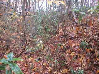 城山の西側下には道路が付けられており、これを進んで行く。この道路の入口はこの辺りである。この日、雨がけっこう降っていた。その辺りから見ると、山の入口付近はかなりのヤブである。これではとても登って行くことはできない。