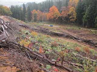 | 作業林道から山麓方向を見下ろしたところ。車が一台ポツンと見えている。 | |