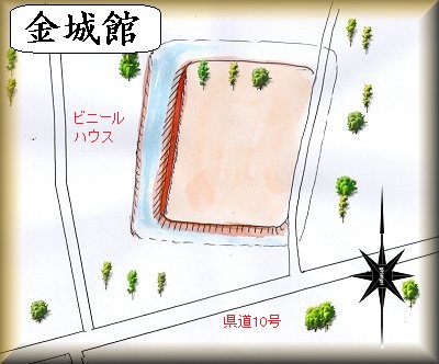 県道10号線からビニールハウスの間を通って、北側に入り込んで行く道がある。これを進んで行って、ビニールハウスの脇を抜けて東側に入り込んで行くと、そこに城塁の名残と思われる地形が見えている。これが金城館の跡である。