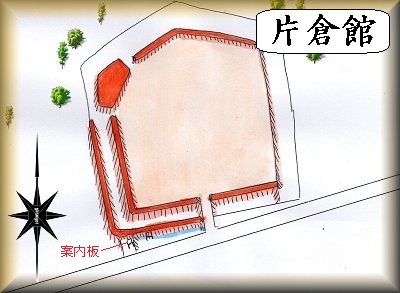 | 片倉館の案内板。 | 中央の土塁上から見る二重堀。 |