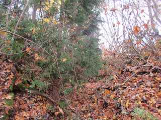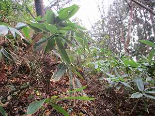 ここから山頂の祠まで参道が付けられているとのことだったので、その道を探してみたのだが、すでに分からなくなってしまっていた。雨上がりでヤブが濡れているため、無理して登るのはやめておいた。