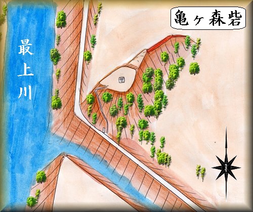 最上川に臨む東岸にある比高20mほどの独立丘が亀ヶ森砦の跡であるという。