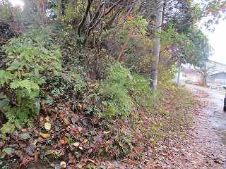 この虎口から南側に入ったところが1郭であったと思われる。1郭は畑となっていて改変されているようだが、南端部分には土手があり、一部土塁状の地形も残されている。