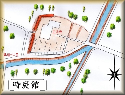 川沿いの微高地にある正法寺という寺院が時庭館の跡である。